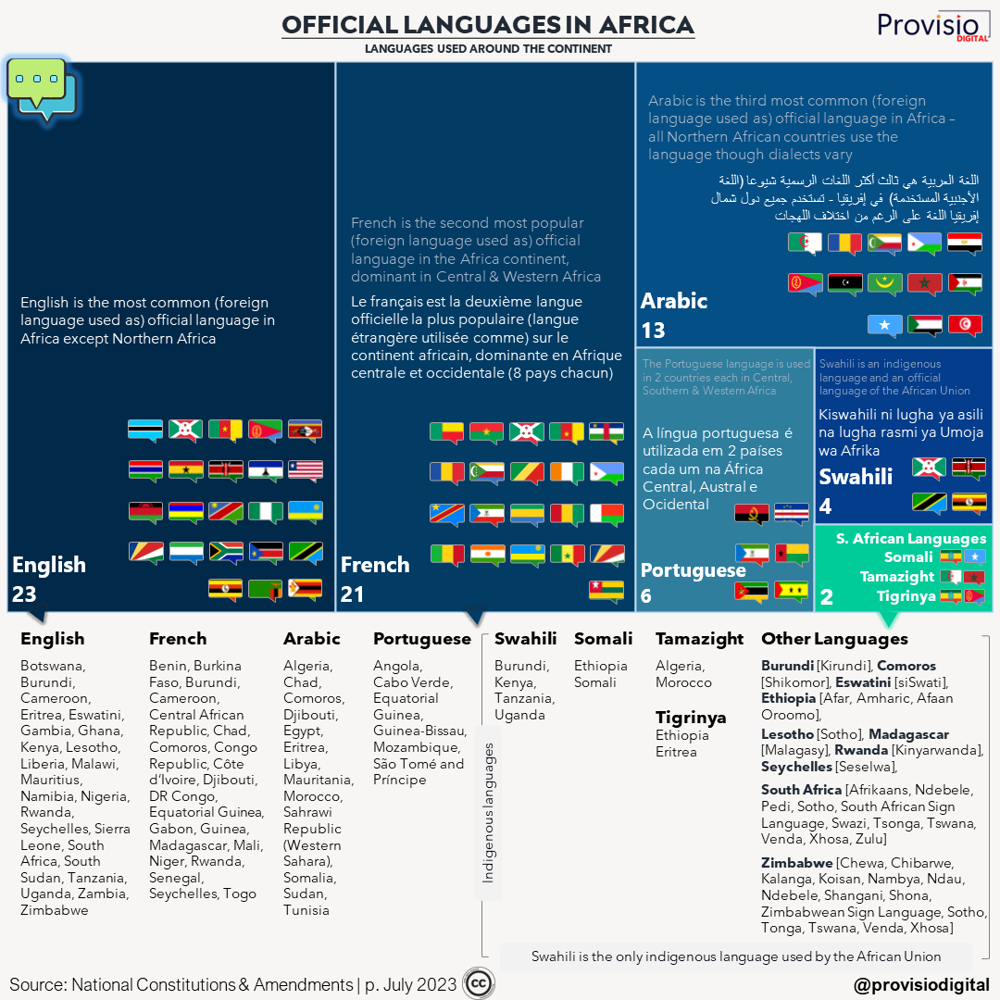 (Official Languages in Africa – An Analysis – Provisio Professional Services) (Official Languages in Africa – An Analysis – Provisio Professional Services) English (blue) is the most common official language across African countries (23 nations), followed by French (21) and Arabic (13). Many African states maintain multiple official languages due to their colonial histories, but English has gained ground as a co-official language even in some traditionally non-Anglophone nations. (Source: Provisio Digital, 2023)