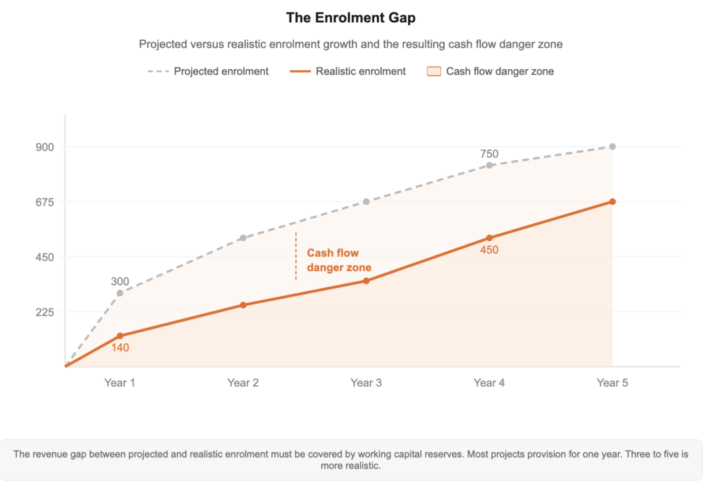 The pattern is familiar. A new school opens, with projections showing 300 students in year one, growing to 600 by year three, and reaching full capacity of 900 by year five. The actual enrolment in year one is 140. By year three, it has reached 320. The gap between projected and actual revenue in years one through three is large enough to exhaust the working capital reserve, and the project enters financial distress before it has had a genuine opportunity to establish itself in the market.